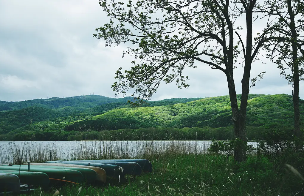 駒ケ岳を仰ぎ見る大沼には、神秘の静けさがあります。澄みきった湖面をゆったりと進むカヌー、そこには今なお野生味が溢れています。